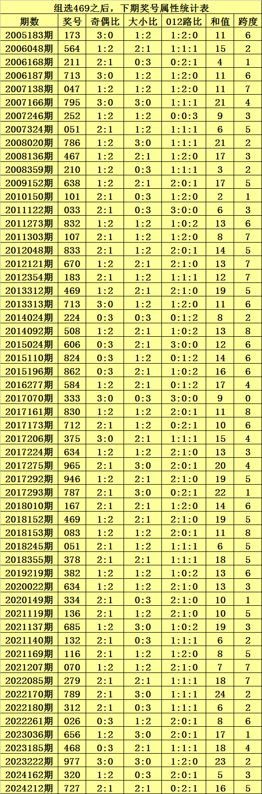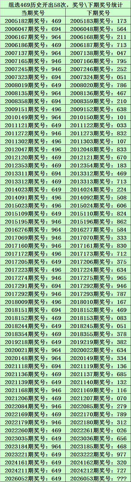 二、组选469分析:胪列三历史上已开出58次组选号码469了,其奖号和下期开出奖号统计如下: