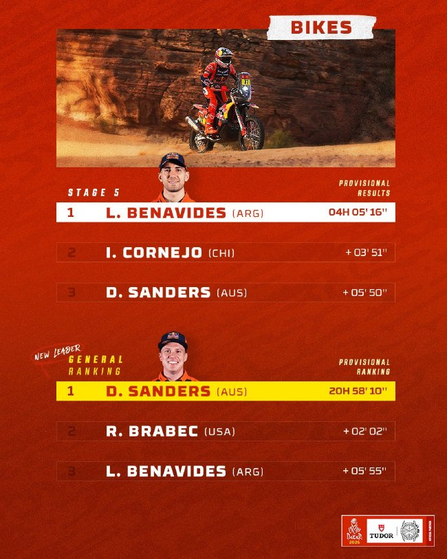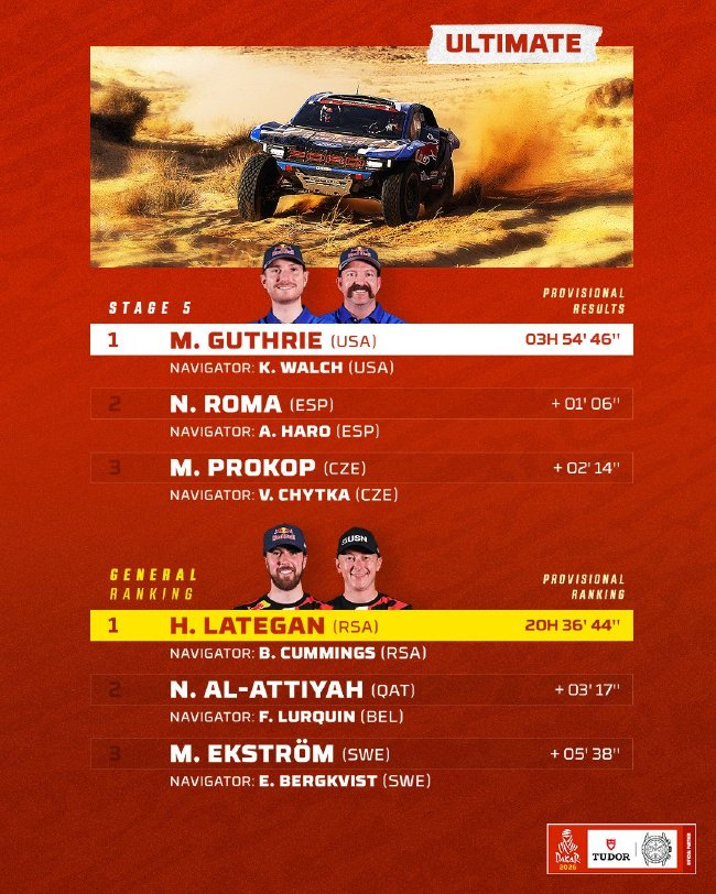 2026年达喀尔拉力赛8日结束第五赛段争夺。这一赛段,车手们将会从沙漠中的马拉松营地出发,摩托车和汽车将会再次采用不同的线路。这一赛段比较高速,且赛段线路比较曲折,容易在赛段中迷路。同时部分道路也充满着岩石,在岩石路段发生失误将会让车手们损失大量时间。