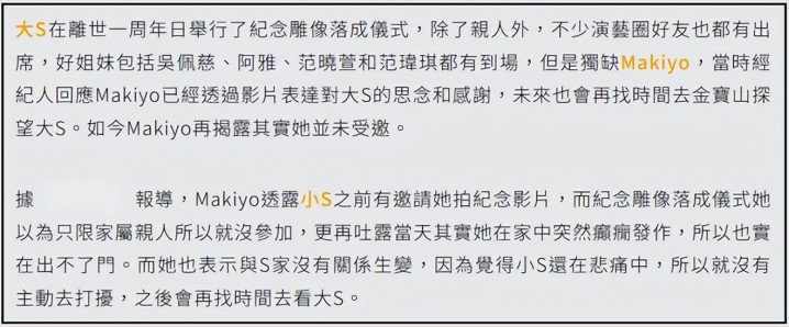 近期大 S 离世一周年的记念雕像落成式,成了 Makiyo 再次走进众人视线的机会,仅仅此次的标签,不再是 “大小 S 的闺蜜”,而是 “缺席者”。今日,华冈七少女中的吴佩慈、阿雅、范晓萱都到场蛮横,具俊晔制作的大 S 骨灰项链,也逐个送到了嫡亲好友手中,惟有少了 Makiyo 的份。一技术,外界纷繁意想她和 S 家的姐妹情生变,以致有东谈主借着她和杨丞琳的旧怨,评述 S 家看人头,为了更当红的杨丞琳,毁掉了过气的 Makiyo。