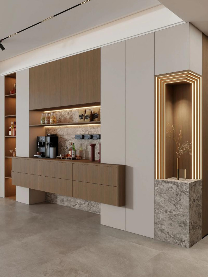 这可能是最实用的升级!提前规划好水电,把嵌入式饮水机、咖啡机、蒸烤箱安排进去。早上泡咖啡、下午泡茶,不用再跑厨房,这里自然就成了家的“水吧核心区”。柜子里记得预留带开关的插座,AG游戏方便小电器使用。
