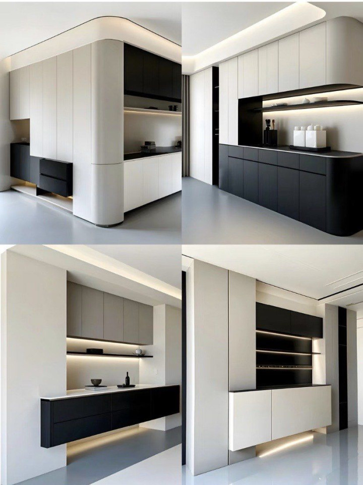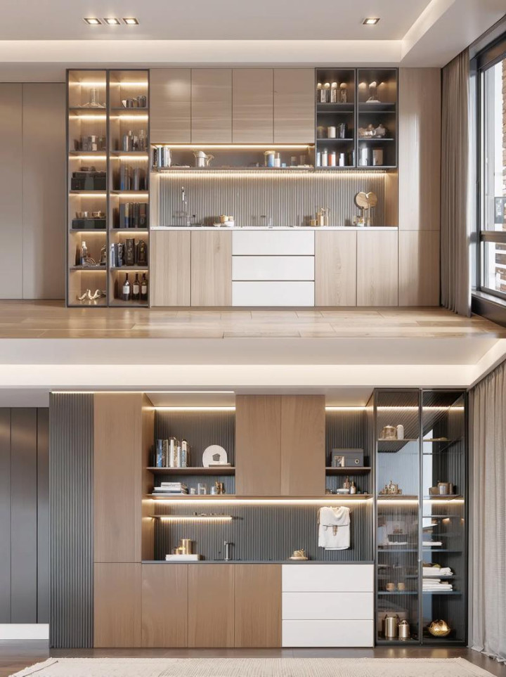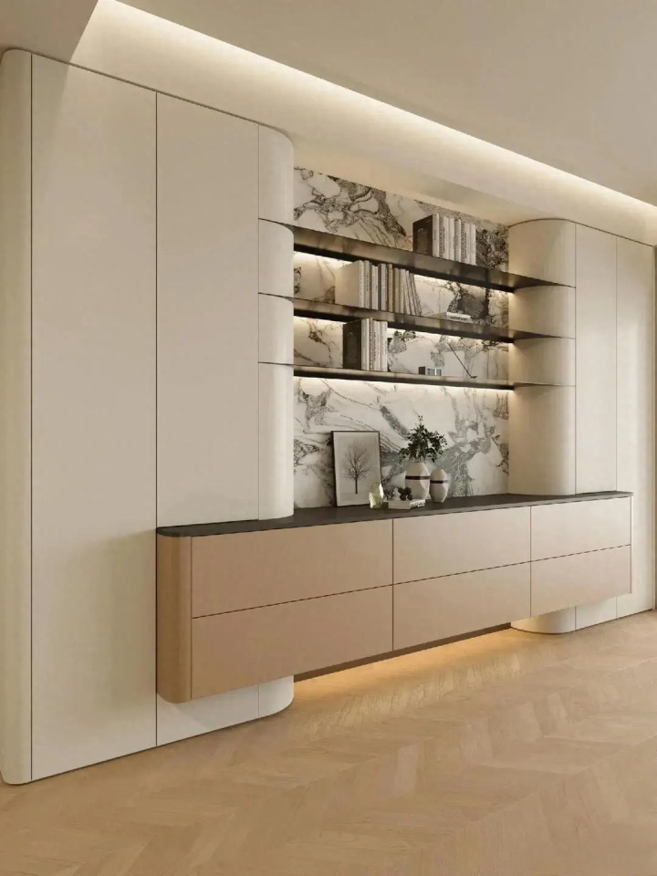 灯光层次:千万别只靠一盏顶灯。在开放格内嵌线性灯带,物品会有博物馆般的展陈效果;台面上方可以装一盏可调角度的射灯,晚上很有氛围。