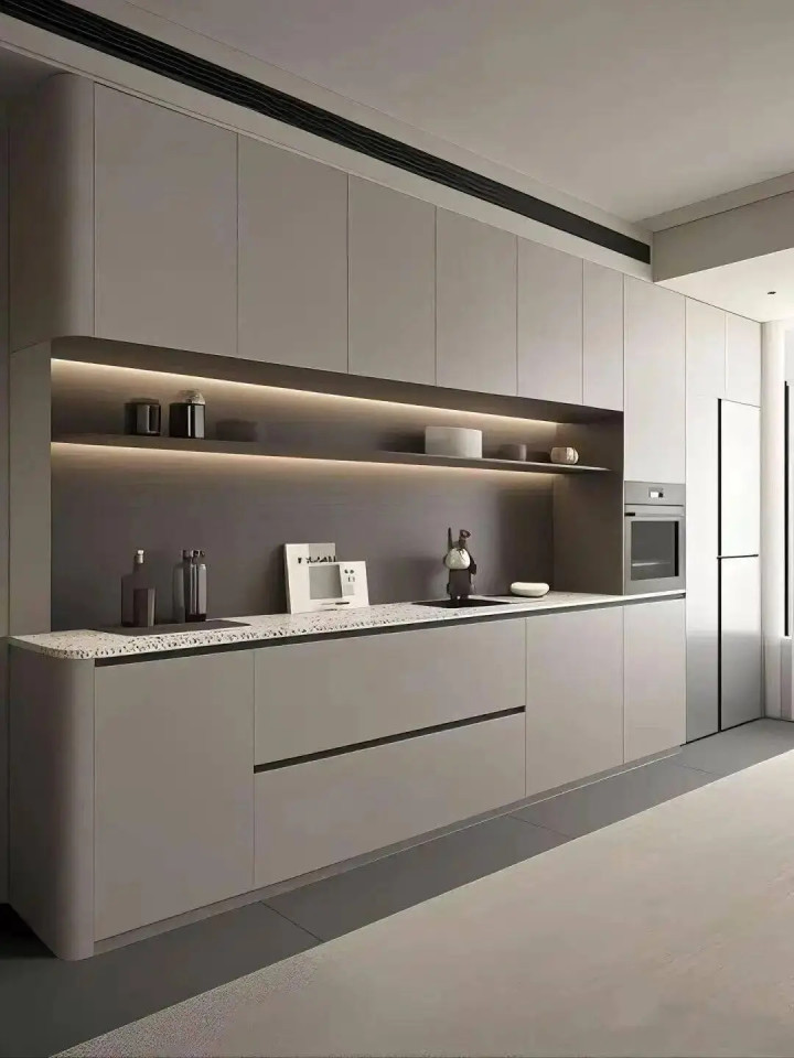 告别全屋单一板材。试试 “岩板台面+木纹柜体+长虹玻璃门” 的组合。岩板耐磨好清洁,木纹温润,长虹玻璃透光不透乱。记住 “二八原则”:80%藏起来(柜门),20%露出来(开放格),放些收藏的杯子、酒瓶或绿植,生活气息就有了。