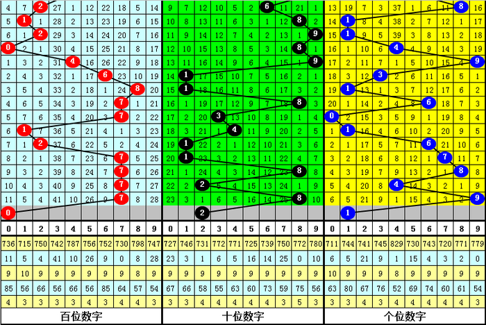 大中小分析:在组选0-9号码分布图中,前10期小 号(0-2区段)出现10枚奖号,中号(3-6区段)出现7枚奖号,大号(7-9区段)出现13枚奖号,上期奖号都在大号区域,本期预计小 号火爆,看好0-2区段走热。