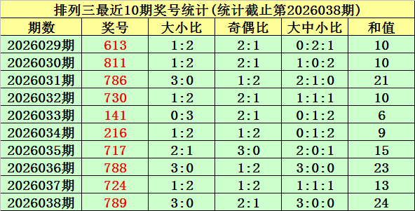 上期回顾:排列三第2026038期奖号为:789。奖号类型:组六,和值:24,奇偶比:2:1,跨度:2,大小比:3:0。
