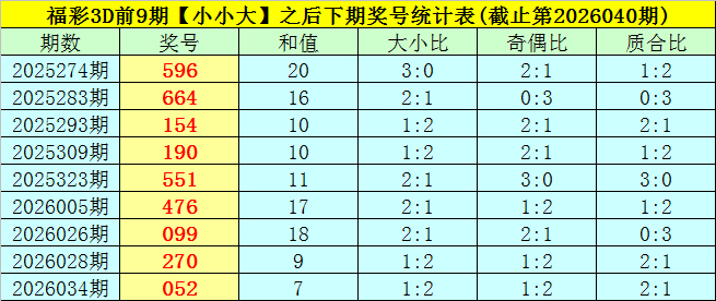 一、上期回顾:福彩3D第2026040期奖号为:425,奖号类型开出组六,大小比为1:2,奇偶比为1:2,和值为11,跨度为3,012路比为0:1:2。