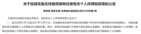 1月14日,财政部、税务总局、住房和城乡建设部(下称“三部门”)联合发布公告,宣布自2026年1月1日至2027年12月31日,延续实施支持居民换购住房有关个人所得税政策。对出售自有住房并在现住房出售后1年内在市场重新购买住房的纳税人,对其出售现住房已缴纳的个税予以退税优惠。