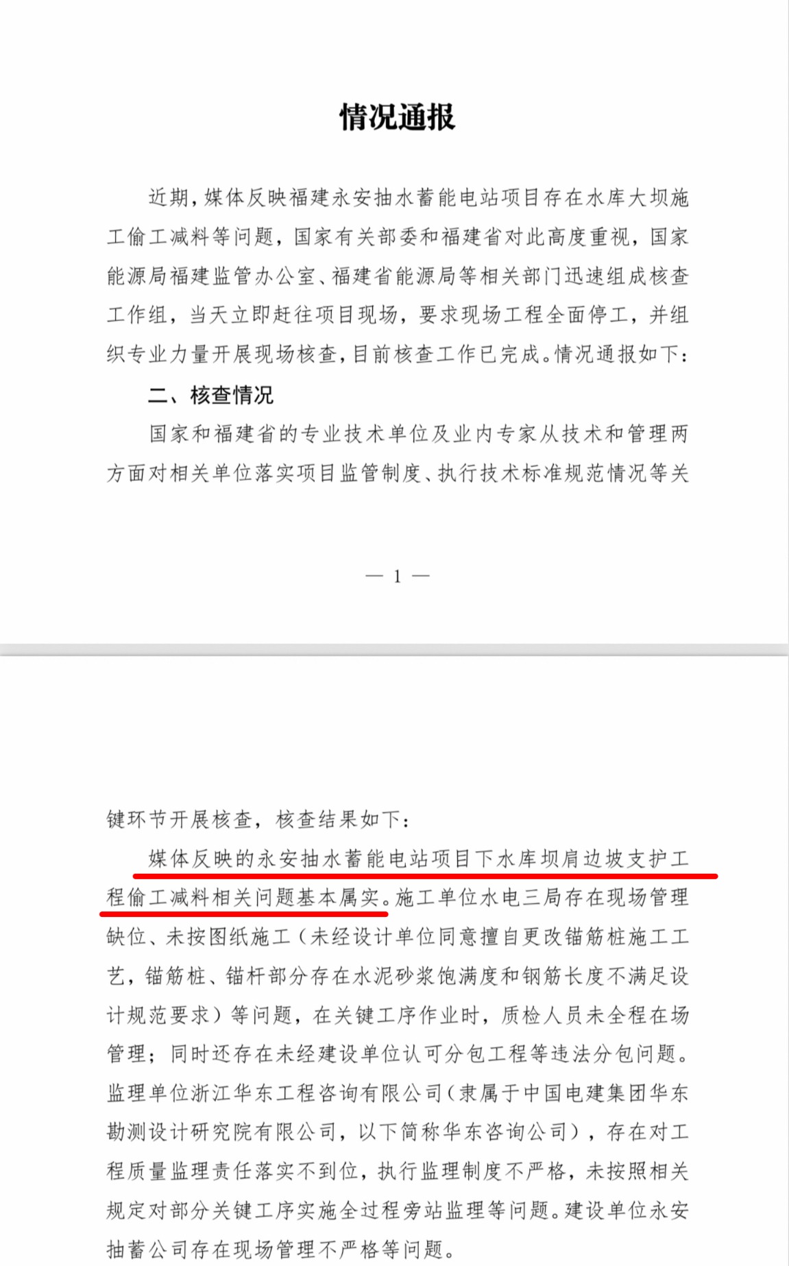 此外通报还透露,目前中国电建已组织所属抽水蓄能工程建设单位全面停工排查,福建省正开展全省抽水蓄能电站工程排查,国家能源局则启动全国范围内安全质量集中整治。相关部门将对项目整改实行挂牌督办,确保问题全部整改到位。