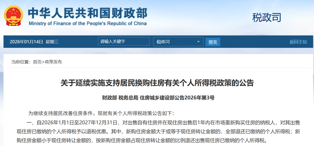 1月14日,财政部官网显示,财政部、税务总局、住房城乡建设部联合发布《关于延续实施支持居民换购住房有关个人所得税政策的公告》。