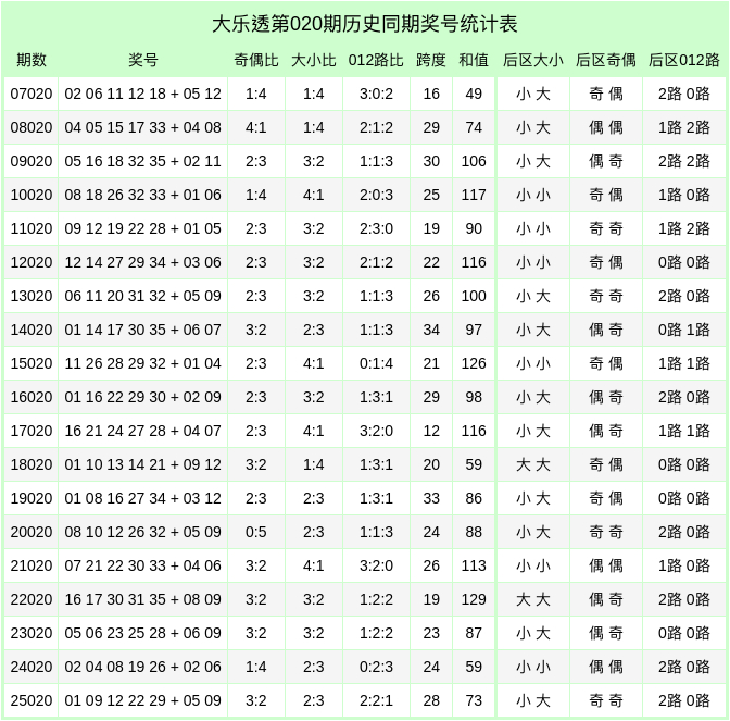 前区大小比:历史同时前区大小比为50:45,大数前区进展较热,最近5年同时前区大小比为14:11,大数前区进展较热;旧年同时前区大小比为2:3,本年瞻望大数前区数目占优,瞻望大小比为3:2。