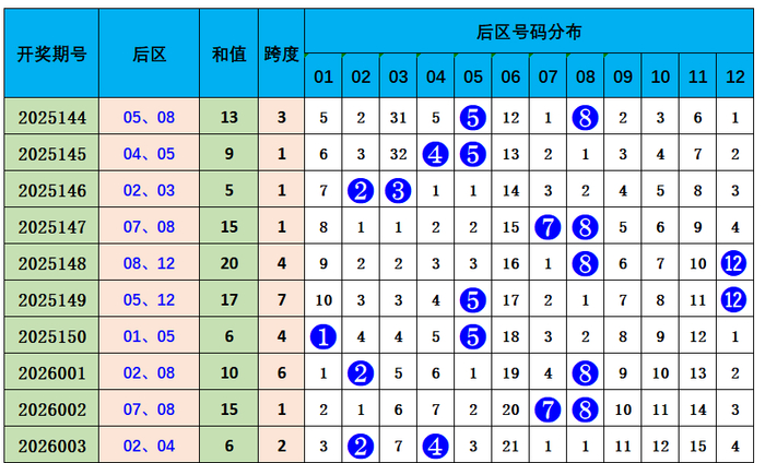 上期后区开出奖号02、04,冷热比1:1,近10期冷热比中,0:2出现6次,1:1出现4次,2:0出现0次,总体热码开出较多。综合分析,本期关注冷热比1:1。