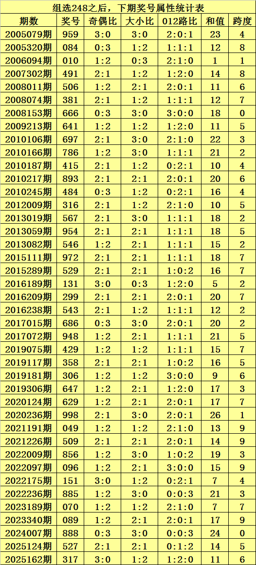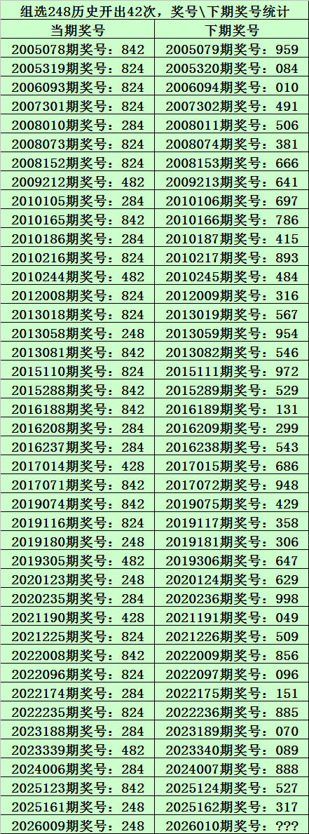 上期回顾:排列三第2026009期奖号为:248,类型:组六,历史上直选号码248出现了5次,组选号码248出现了42次。