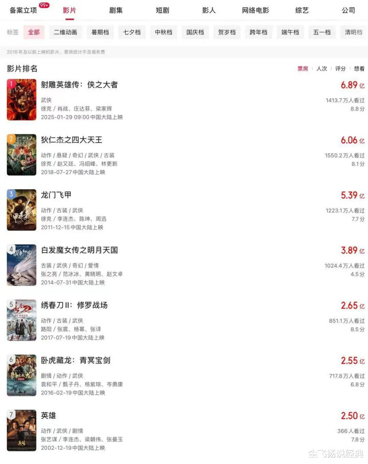 近十年来,能把武侠片做到六七亿的,只有徐克一人。武侠片的最好成绩,在票房总榜的排名是二百多名。