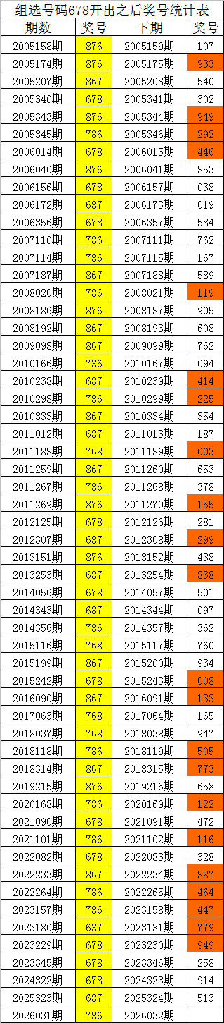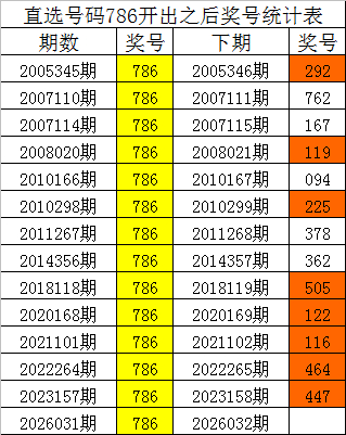 从上表统计可以看出,直选号码786开出之后,其下期奖号: