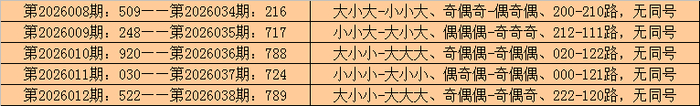 在排列三历史开奖中,第2026008期-第2026012期连续5期奖号为:509-248-920-030-522。