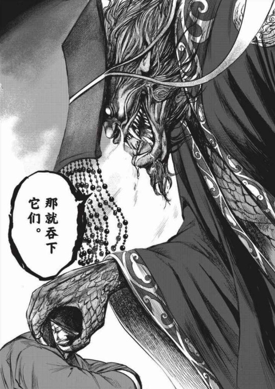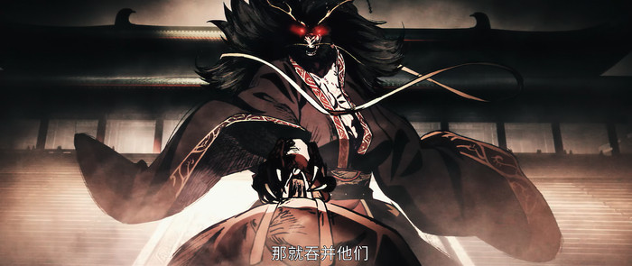 之后,猛虎环伺第三个大臣裴世矩。裴世矩颇有一种黑云压城的紧迫感。猛虎见他不是死谏,只是汇报工作,便逐步化身龙袍巨人。巨人的头颅和手,随着圣谕下达,又显现龙首龙爪之相,甚至滴出涎液,令裴世矩瑟瑟发抖。